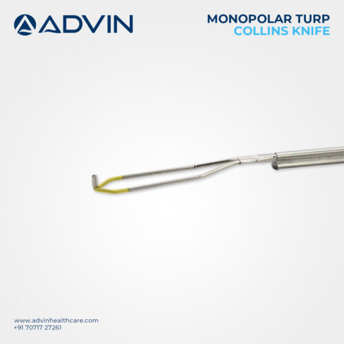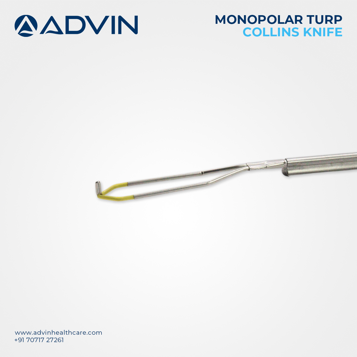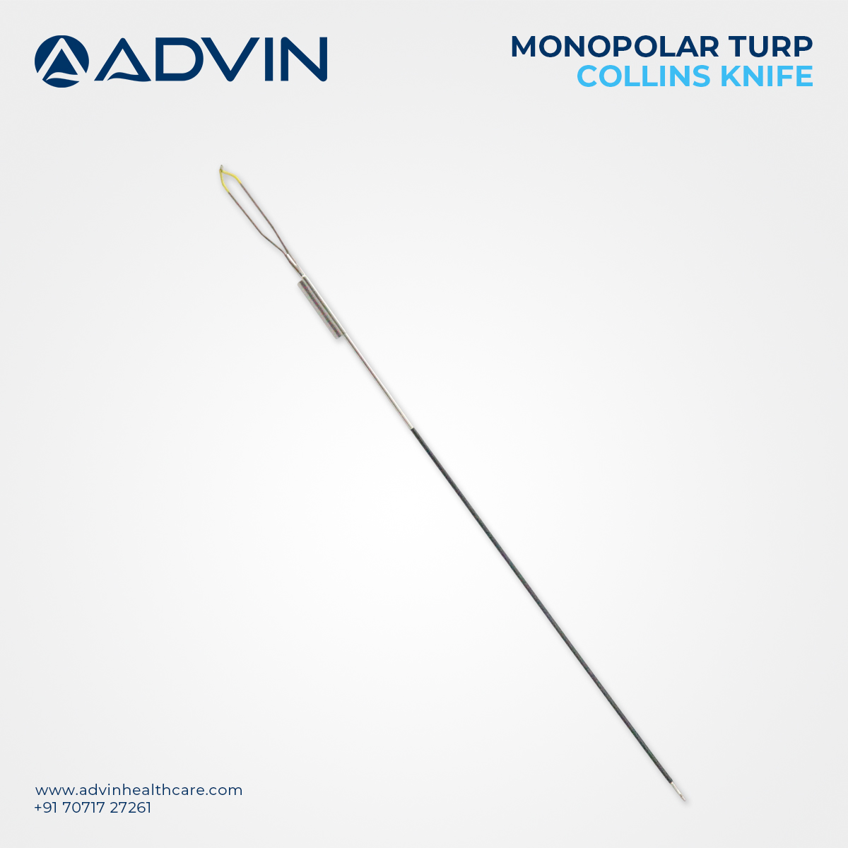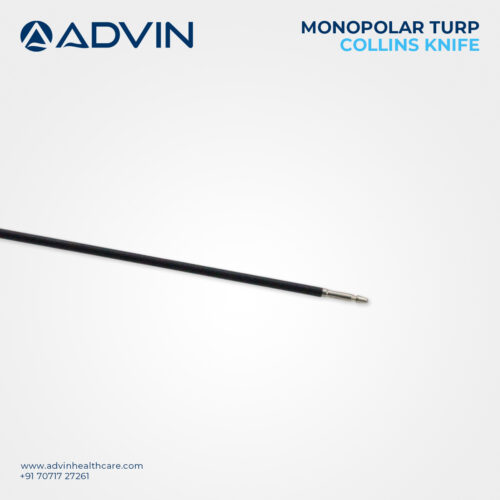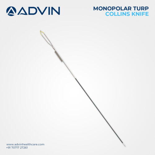 Monopolar TURP Collins Knife is a surgical accessory used during TURP (Transurethral Resection of the Prostate) procedures for sharp, controlled incisions. This electrode features a fine knife-like tip that allows for precise resection of dense or fibrotic tissue, particularly around the bladder neck or prostate. It is compatible with monopolar resectoscope systems and delivers consistent electrical performance for efficient cutting. The instrument supports minimal bleeding and improved visualization, contributing to safer and faster urological procedures. Advin Health Care manufactures the Monopolar TURP Collins Knife to meet international standards of safety, reliability, and surgical precision.